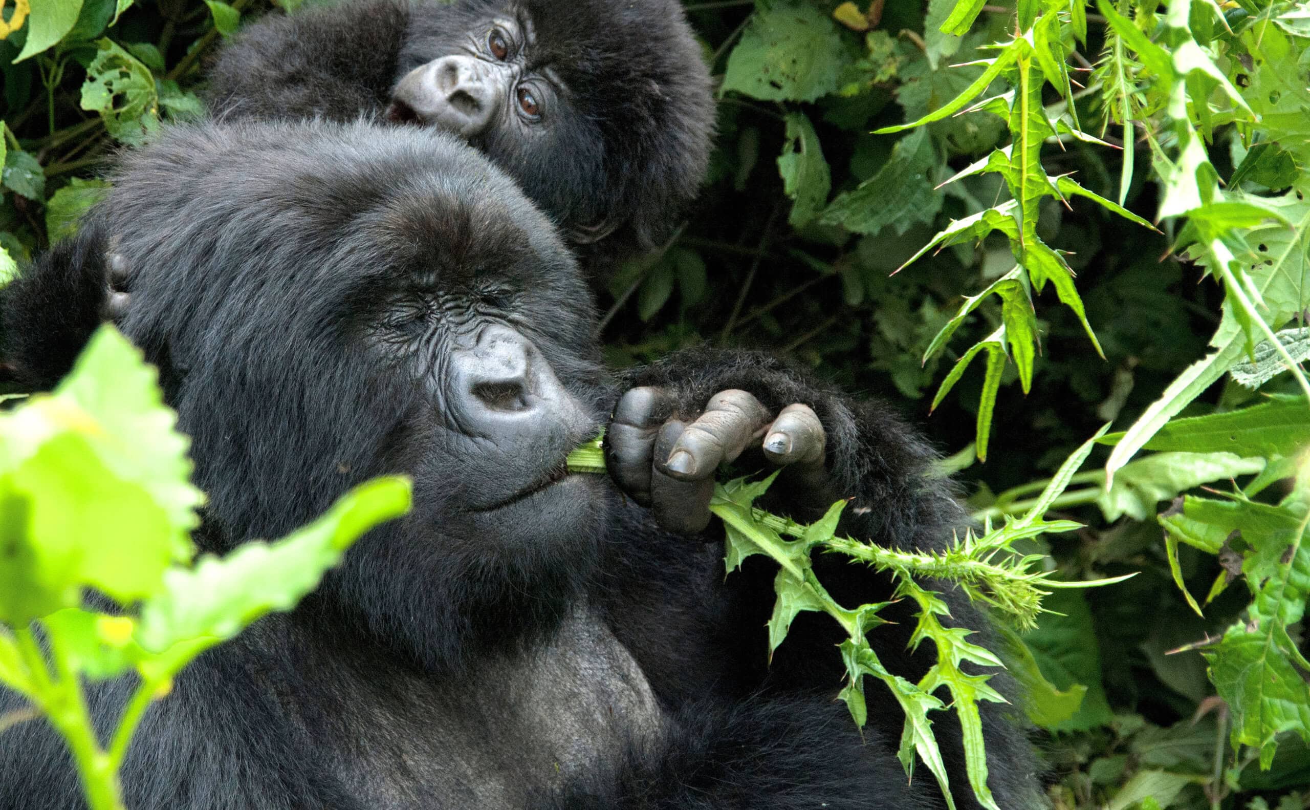 Altitudes for the gorilla tracking portions of the trip range from approximately 3,900 feet to approximately 7,500 feet. You will be hiking through dense, thorny bush covering up to four miles or more in distance. You may be hiking in all types of weather; rain can occur in these mountains at a moment's notice. The climate is hot and humid. We will often hike uphill to follow the clans, but will take breaks along the way. The hike to see the chimpanzees takes an average of 2.5 hours, though it can last up to 4 hours when chimps are on the move in search of food. We will hike on marked trails for at least part of the trek. However, as with the mountain gorillas, we will follow the chimps' movements, prompting us to sometimes go off-trail based on their wanderings. Altitudes during this portion of the trip range from approximately 3,900 feet to approximately 4,600 feet. Conditions can be boggy and since we are in a tropical rainforest, it can rain at any time.