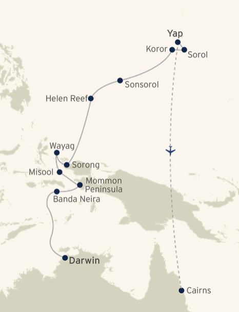 Sorong is your departure point from the Indonesia region. Lushmountains covered with forest surround the town and fishing is amajor part of the local economy. Go ashore to visit theSorong Nature Conservation Park to see the big old trees plantedby the Dutch many years ago. You will also be welcomed by the MoiTribe, the owners of the land, who are culturally unique from otherpeoples in the surrounding regions. Enjoy demonstrations such as