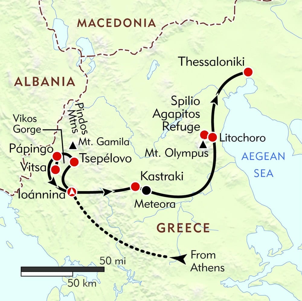 Traditional Greece can still be found in Zagoria, where stone-built villages perch above the Vikos Gorge. We discover this realm on hikes along shepherds' paths and across arched stone bridges that span the gorge. Heading to the famed monasteries of Meteora, we'll follow the monks' footpaths through these airy medieval sanctuaries, built in the 13th century. Our grand finale is an incredible hike up Mt. Olympus, storied home of the gods, where we gaze over the ancient world from the summit. Our Trip Leaders make culinary adventures a highlight of the journey, and we'll fuel our hikes by sampling seasonal delights of northern Greek cuisine.