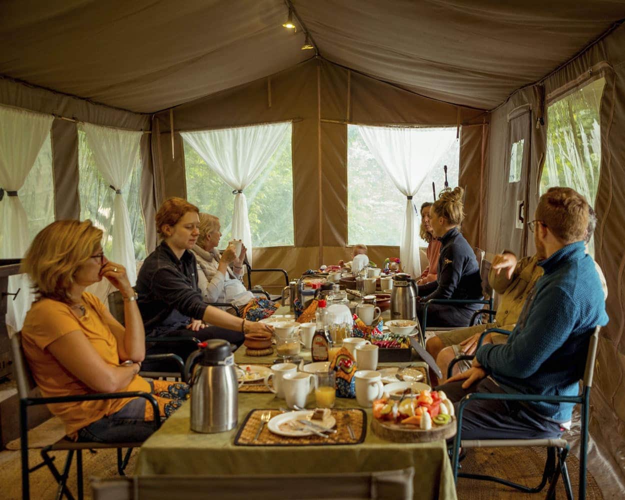 Mount Meru Camp, set at nearly 6,500 feet in the ancient montane forest on the slopes of Mount Meru, is a fantastic, off-the-beaten-track hideaway and the perfect jumping off point for our Kilimanjaro climb. Each tent features wood framed beds, an en suite bathroom with a bucket-type shower and flush toilet, a small private veranda with chairs and a washstand, and solar powered lighting. A lounge tent, set in an open glade, has a wide veranda to keep it cool during the heat of the day, and a separate mess tent serves wonderful food created by our resident chef over an open fire (a specialty is barbecued meat and vegetable kebabs). Mount Meru Camp is great for acclimatization, and the two nights sleeping at 6,500' give you the head start that will help you get to the summit of Kilimanjaro.